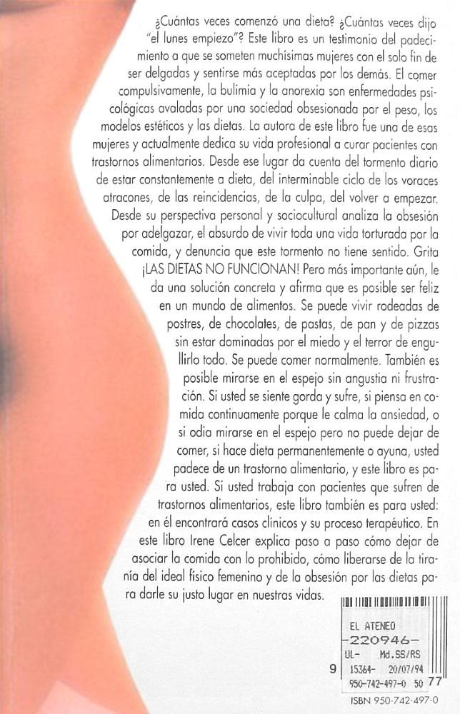 En su primer libro, la Lic. Celcer esboza la tiranía de la dieta, que muestra los sacrificios que las mujeres bulímicas y anoréxicas pasan por el fin de lograr su una obsesión: ser delgada.